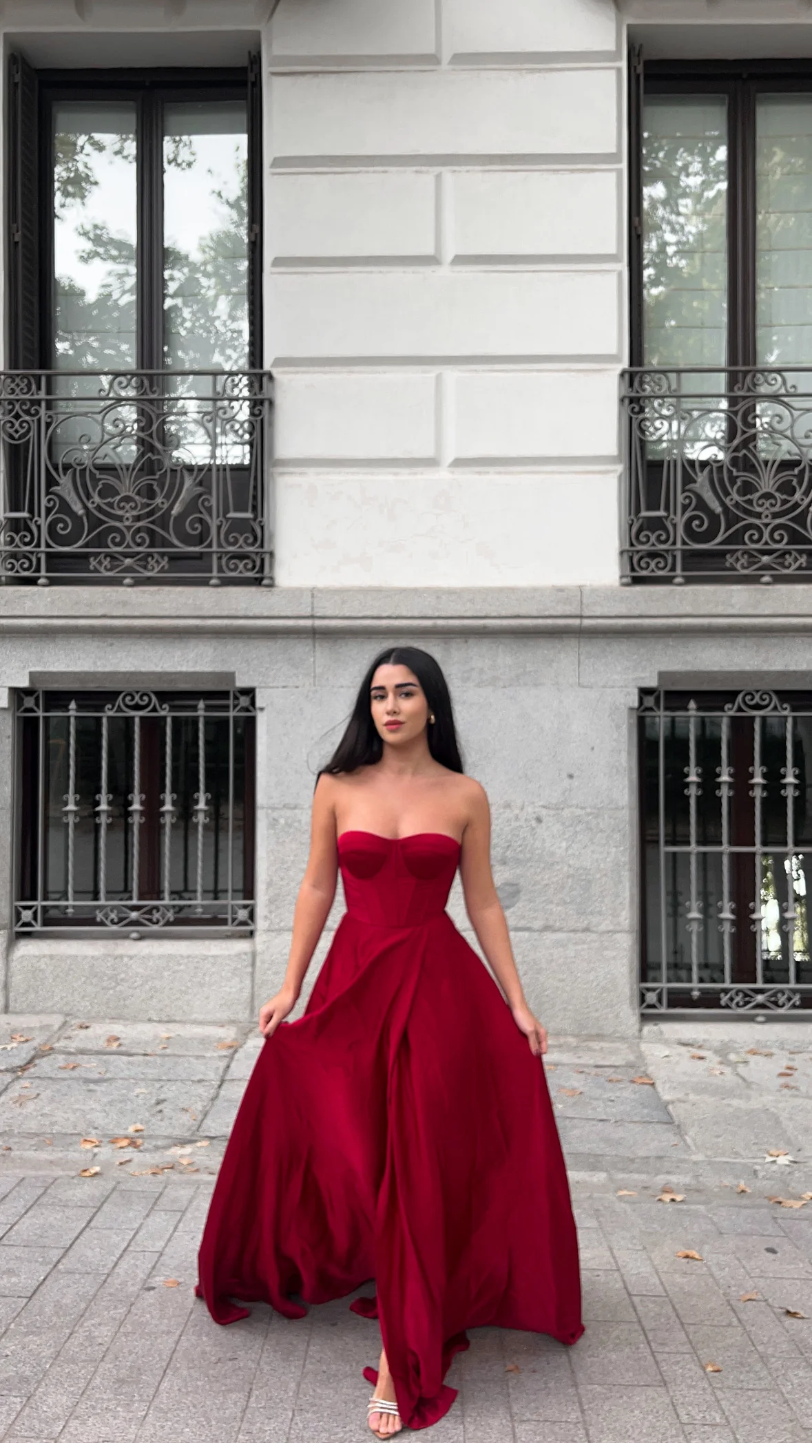 Vestido corset armado con varillas y copas. Silicona en el pecho para poder ponerlo palabra de honor y tirantes regulables quita y pon.